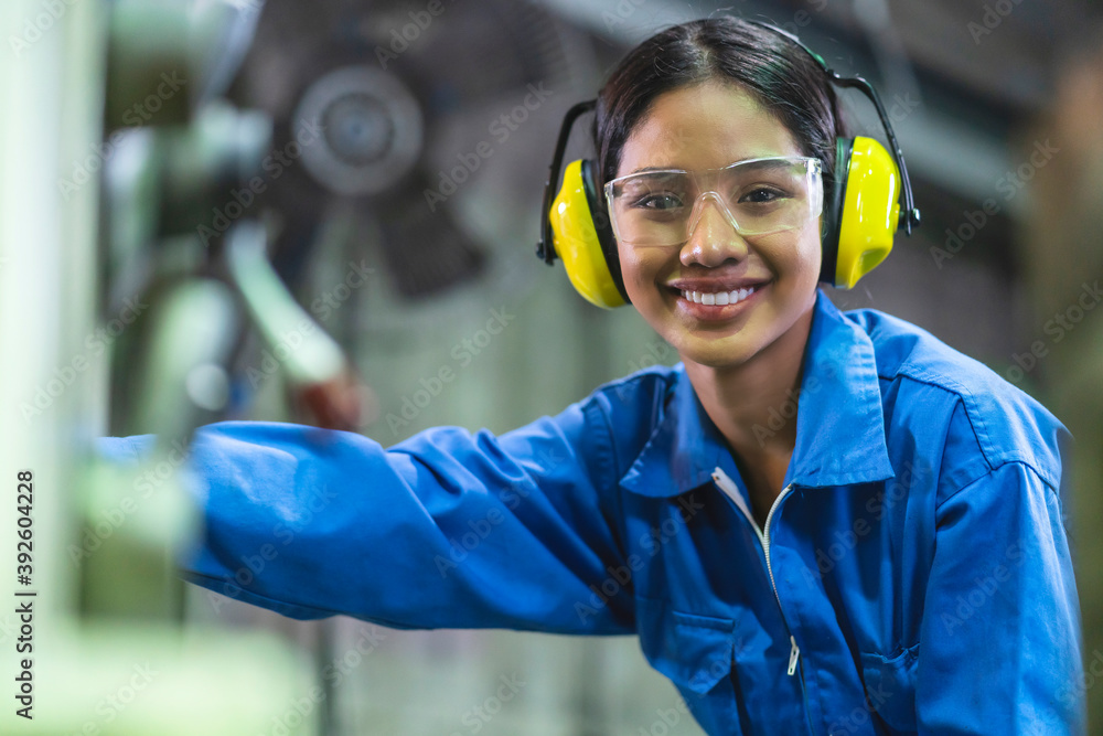 portrait asian female Professional engineering wearing uniform and safety goggles Quality control, maintenance, check in factory, warehouse Workshop for factory operators