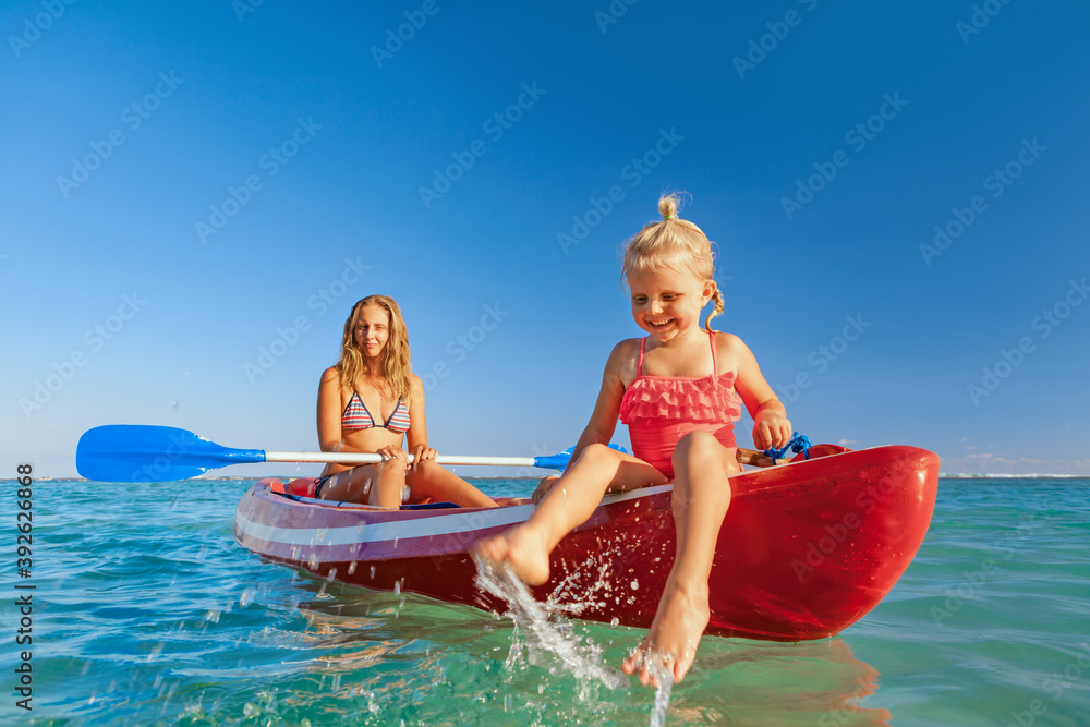 Happy family - young mother, children have fun on boat walk. Woman and child paddling on kayak. Travel lifestyle, parents with kids recreational activity, watersports on summer sea beach vacation.