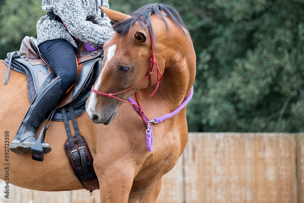 Horse and rider - training - no bit - only a halter in the paddock - ranch