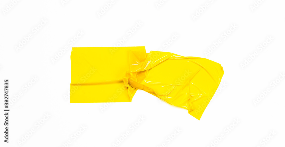 yellow tapes on white background. Torn horizontal and different size yellow sticky tape, adhesive pieces.