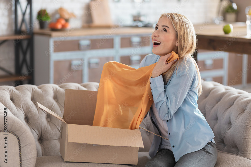 Happy young woman received a long-awaited parcel of clothes. Joyful woman opened a box with clothes