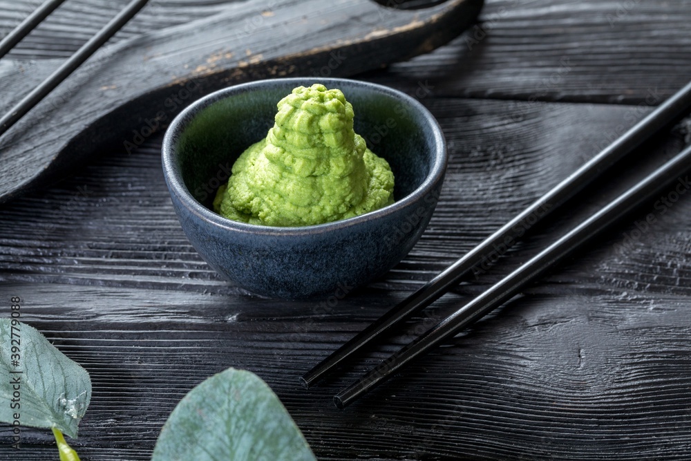 wasabi in a ceramic saucepan. Black wooden background and decor.
