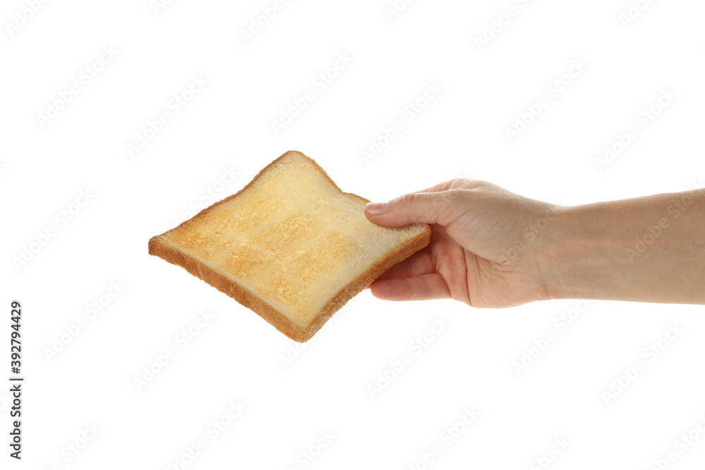 Female hand hold toast bread, isolated on white background