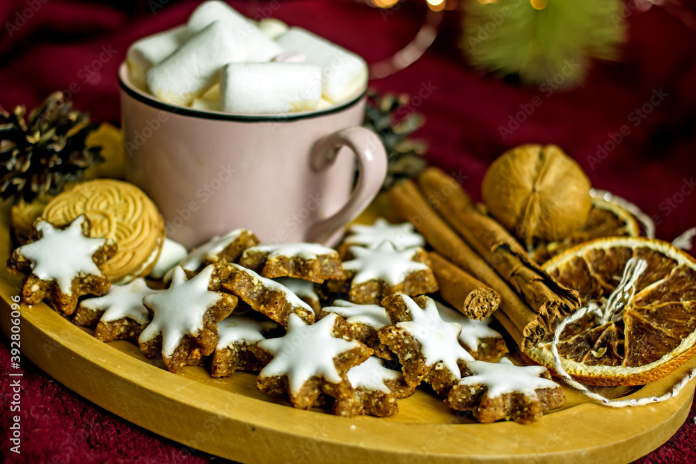 Homemade Christmas cookies stars from nuts and dates on a wooden tray, next to a mug of coffee, New Year's decor of pine cones and garlands. Cozy winter tea party, sweet new year food gift
