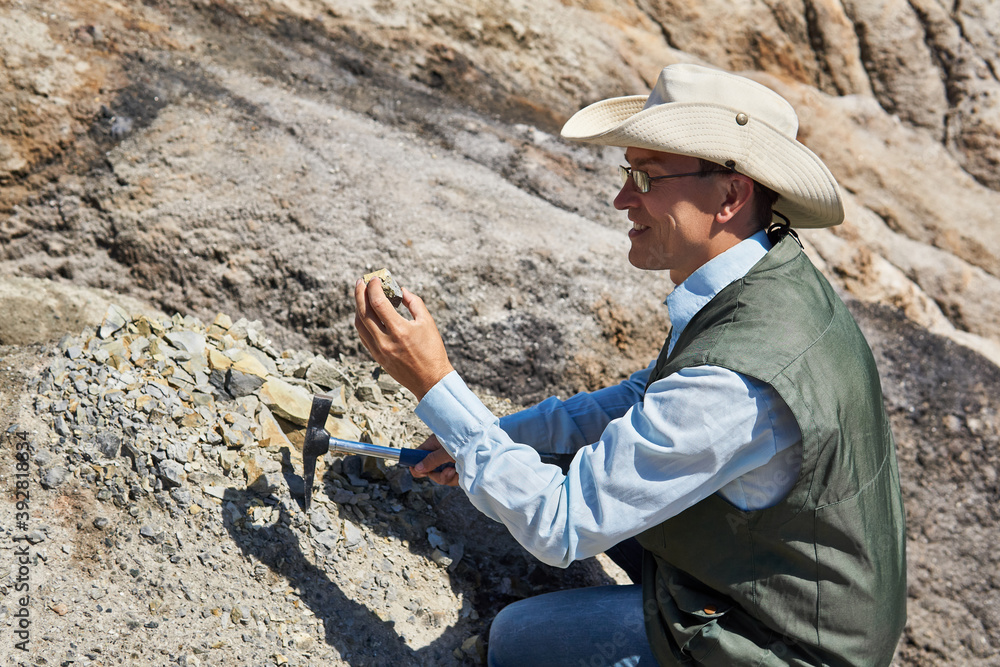 man geologist examines a rock sample in a desert area