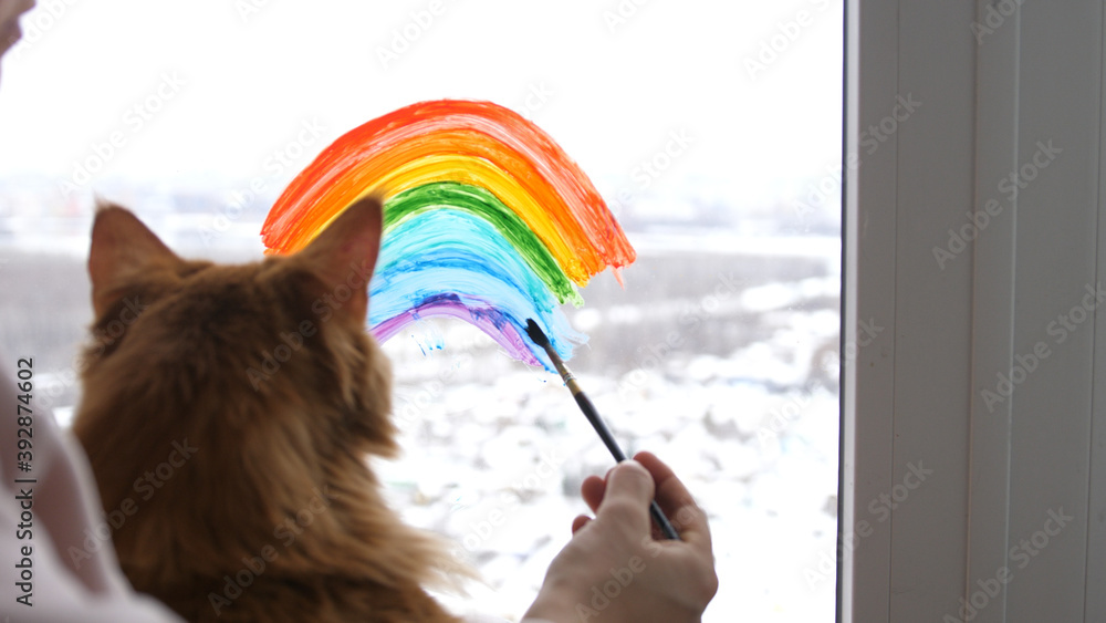 Young woman sitting with cat and painting rainbow on window during Covid-19 quarantine at home in winter. Stay at home Social media campaign for coronavirus prevention.
