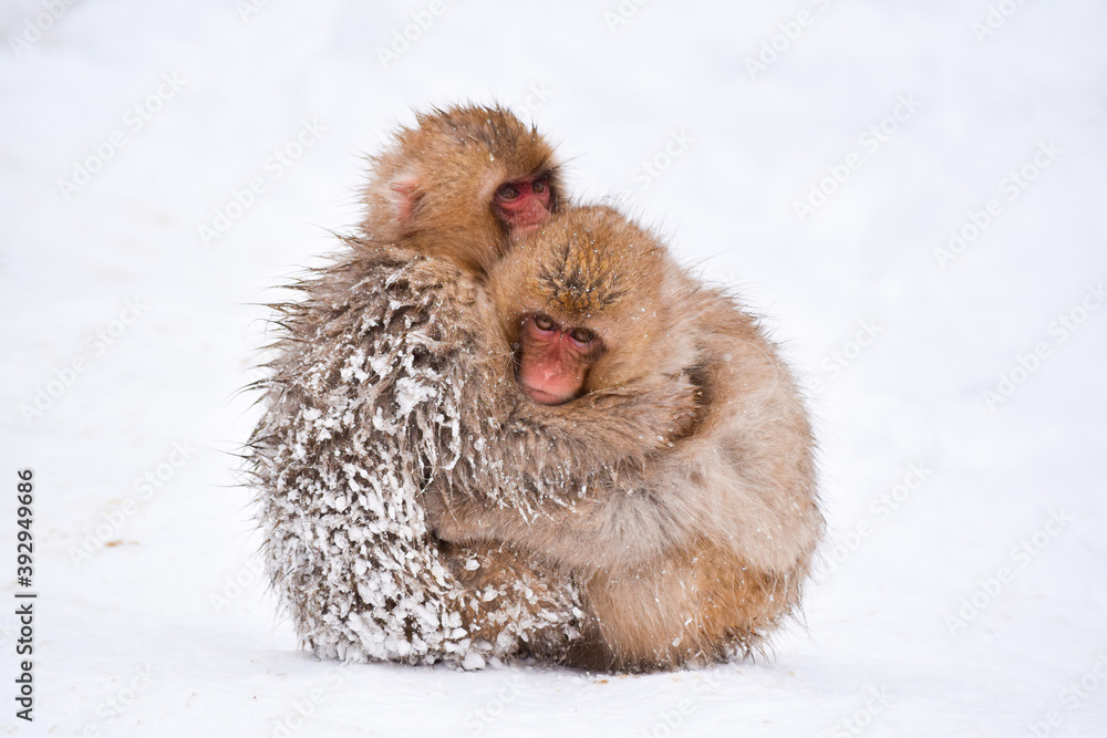 two brown cute baby snow monkeys hugging and and sheltering each other from the cold snow with ice in their fur in winter. Wild animals showing love and protection during difficult times in nature.