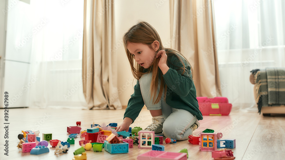 A cute little girl playing with her toys on the floor of a spacy kitchen