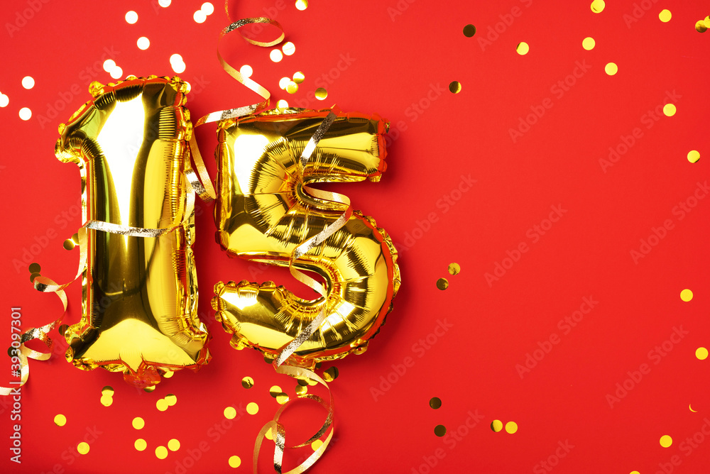Gold foil balloon number, digit fifteen. Birthday greeting card, inscription 15. Anniversary celebration event. Banner. Stylish golden numeral, bright shiny glitter, red background. Numerical digit