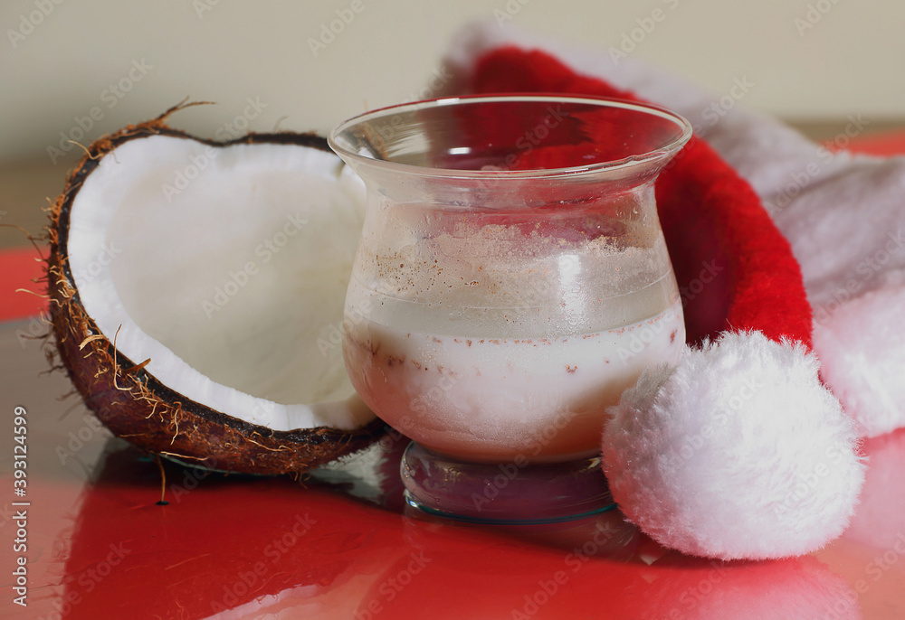 Close up. Puerto Rican drink with a piece of coconut. Coquitoo National christmas beverage.