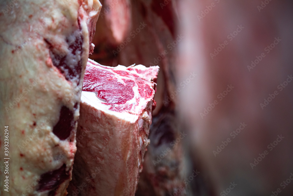 Meat Industry Hanging Cold Storage Japanese Wagyu beef is cut and hung on a hook in slaughterhouses.