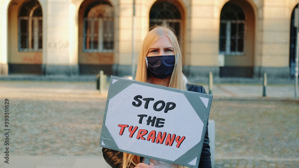 Young woman in protective mask calling to stop the tyranny by holding steamer. Protest walk in the city center.
