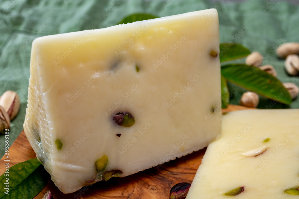 Cheese collection, fresh Italian pecorino cheese made from sheep milk filled with pistachio nuts from Bronte, Sicily
