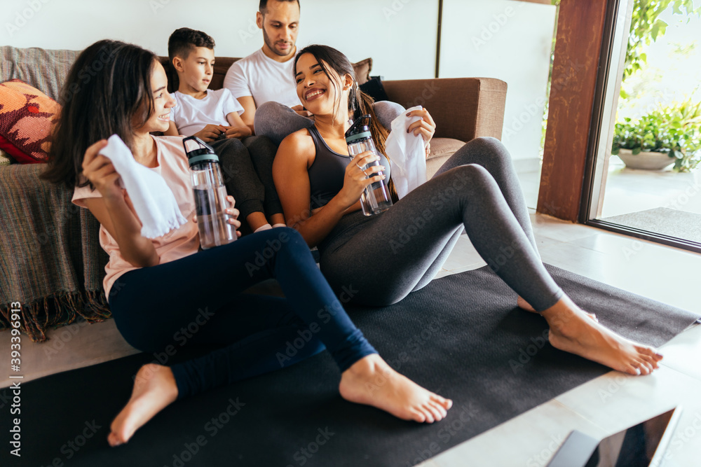 Latin mother and daughter rest after exercising at home.
