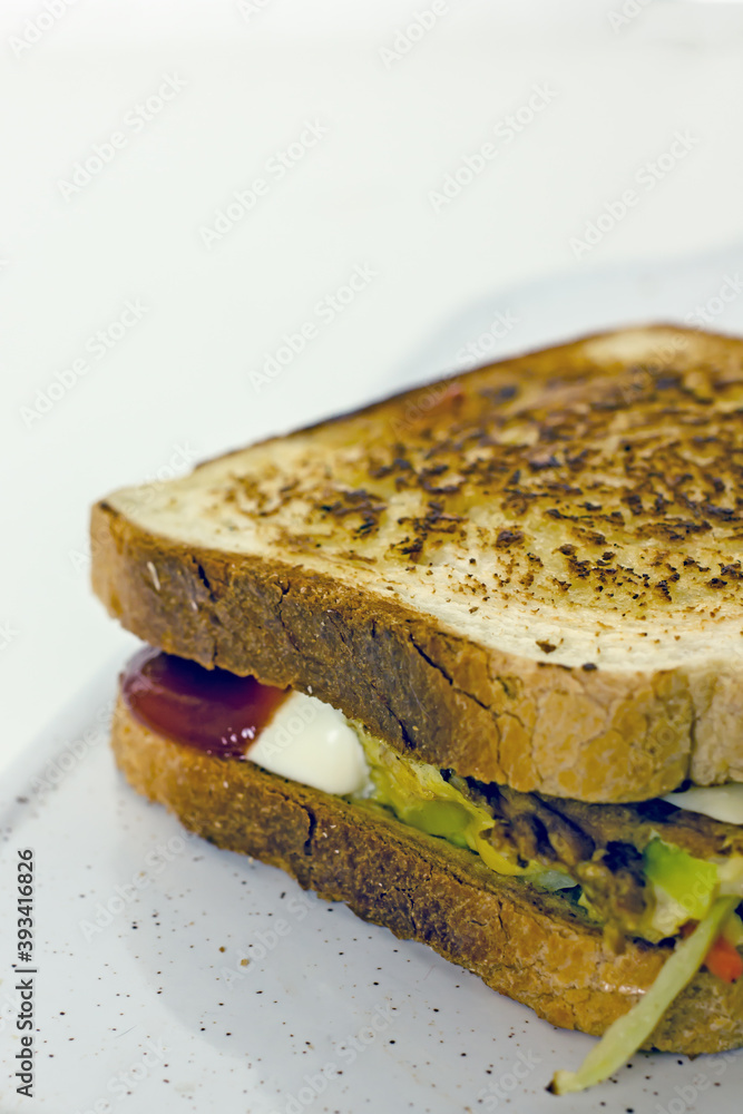 Homemade Korean toast sandwich with eggs, cabbage, carrots, onions, mayonnaise, ketchup and cheese in a cut with visible filling on a white board. DIY fried Korean sandwich, close-up