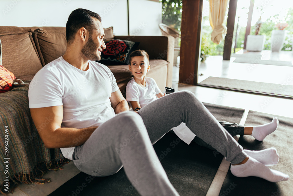 Latin father and son rest after exercising at home