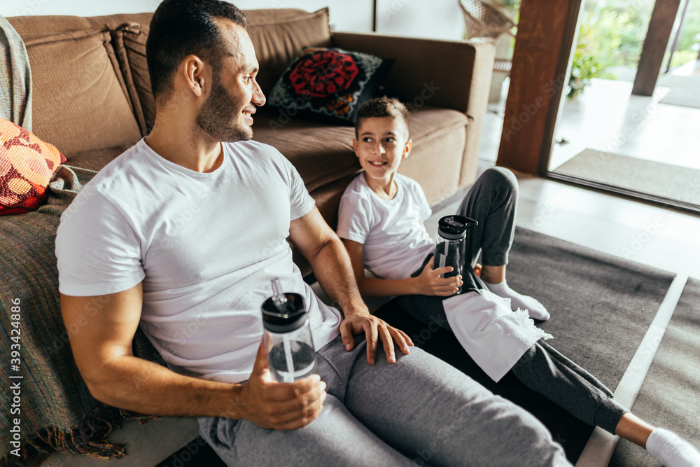 Latin father and son rest after exercising at home