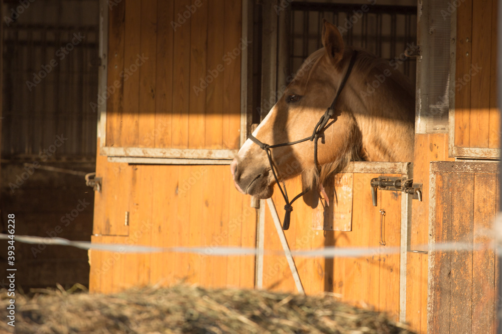 horse in the stable at sunset - meadow fence, door, hay, wood