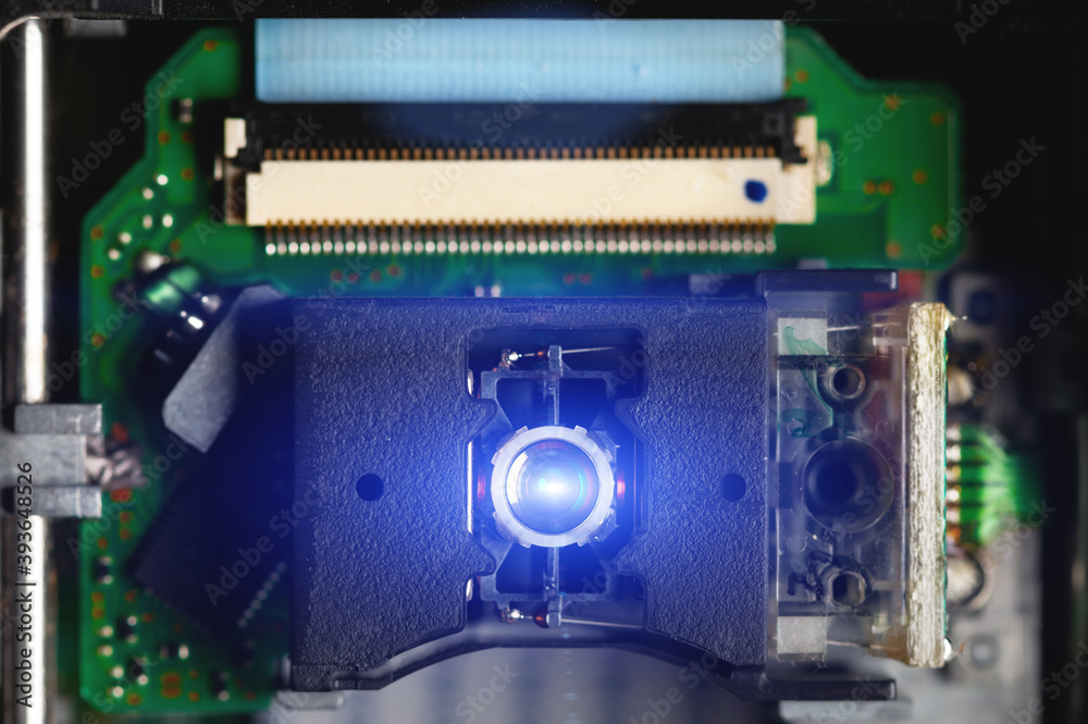 Close-up of a laser lens for reading and writing dvd roma cd drive. Readout optical design