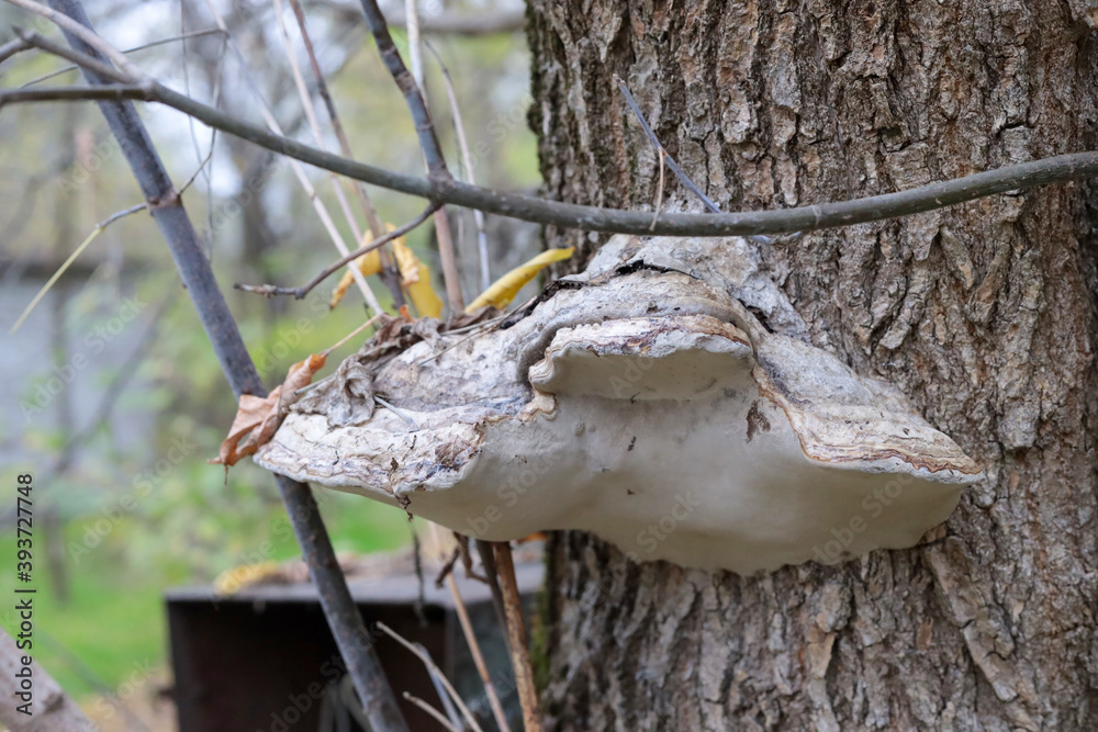 White huge roof mushrooms growing on a tree trunk in a green autumn forest..
