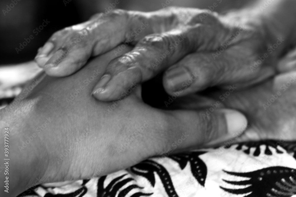 Human holding hands full of love affection in black and white background. Senior Asian women, mother and daughter, holding hand showing love care and life supported.