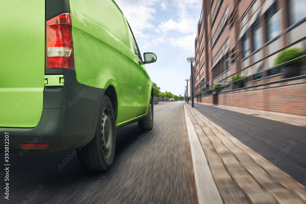 Green delivery van driving on a street in the city