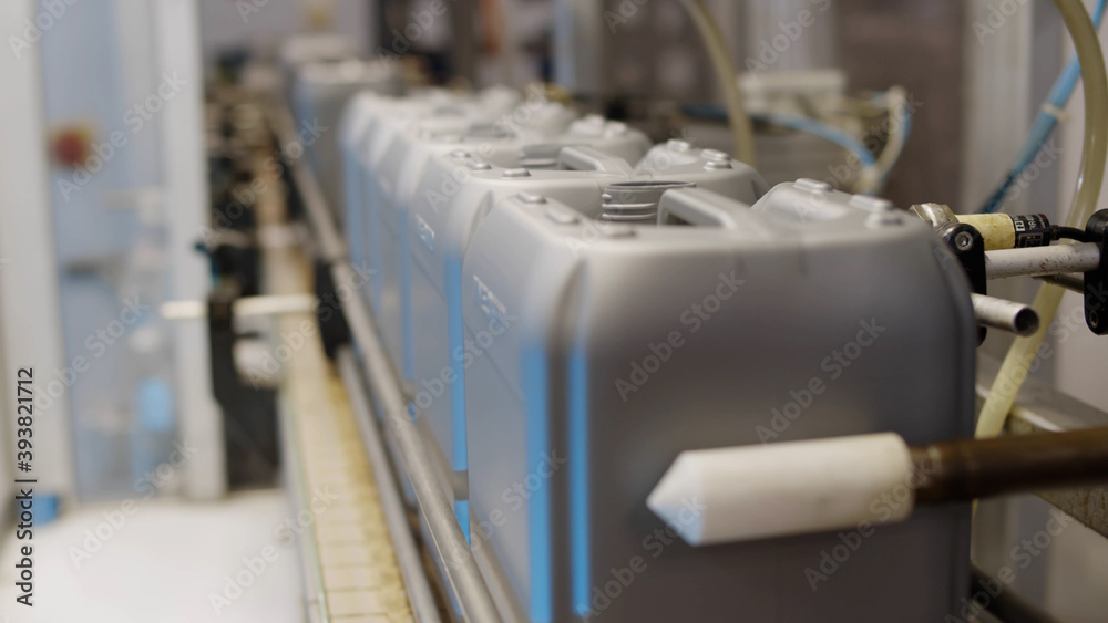 Plastic gallons or bottles on production line at filling machine in factory.