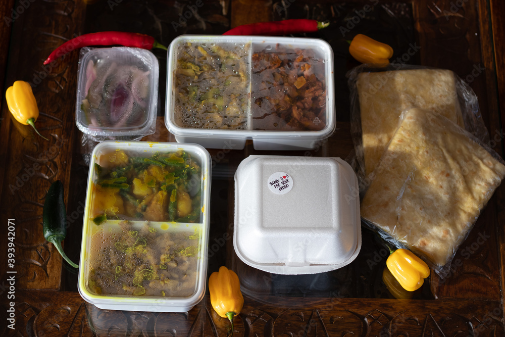 Curry, roti, potatoes, Indian and surinam food inside a take away plastic over a rustic table