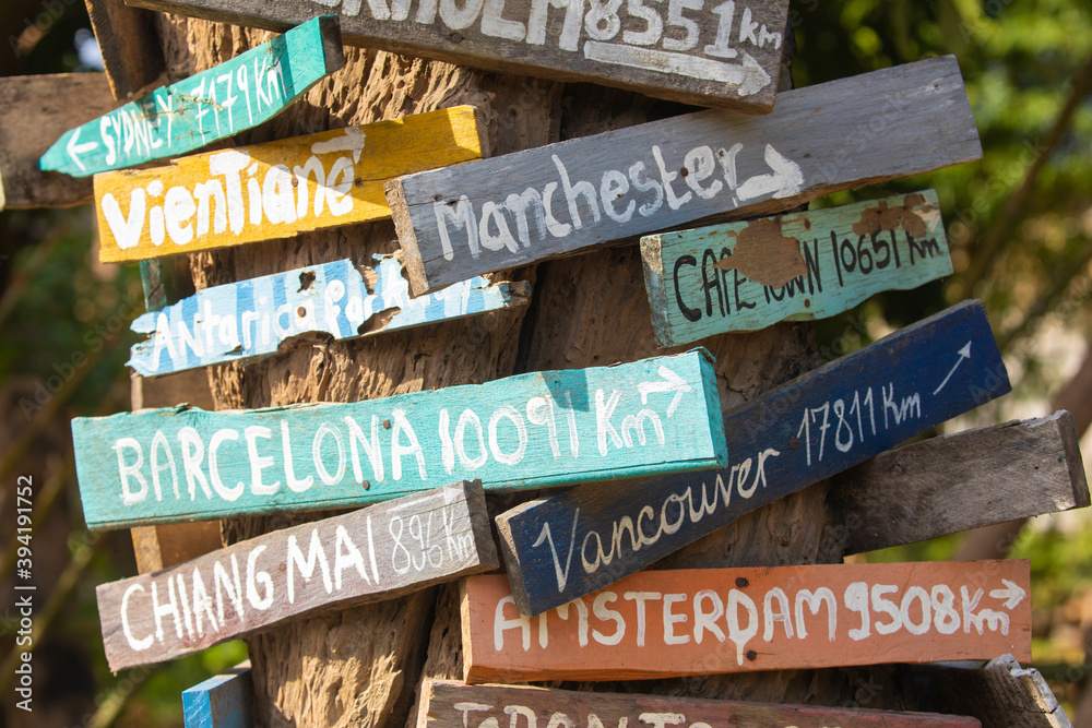 Colourful hand painted direction wood signs to different cities of the world, and mileage marker in Don Det island, one of the famous Four Thousand Islands or Si Phan Don, in the Mekong river, Laos.