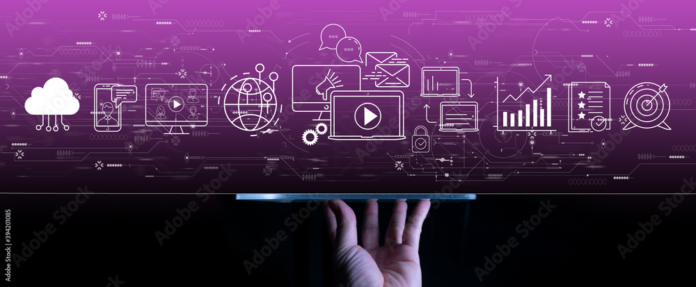 Digital marketing with person hand using a digital tablet computer on dark violet background.