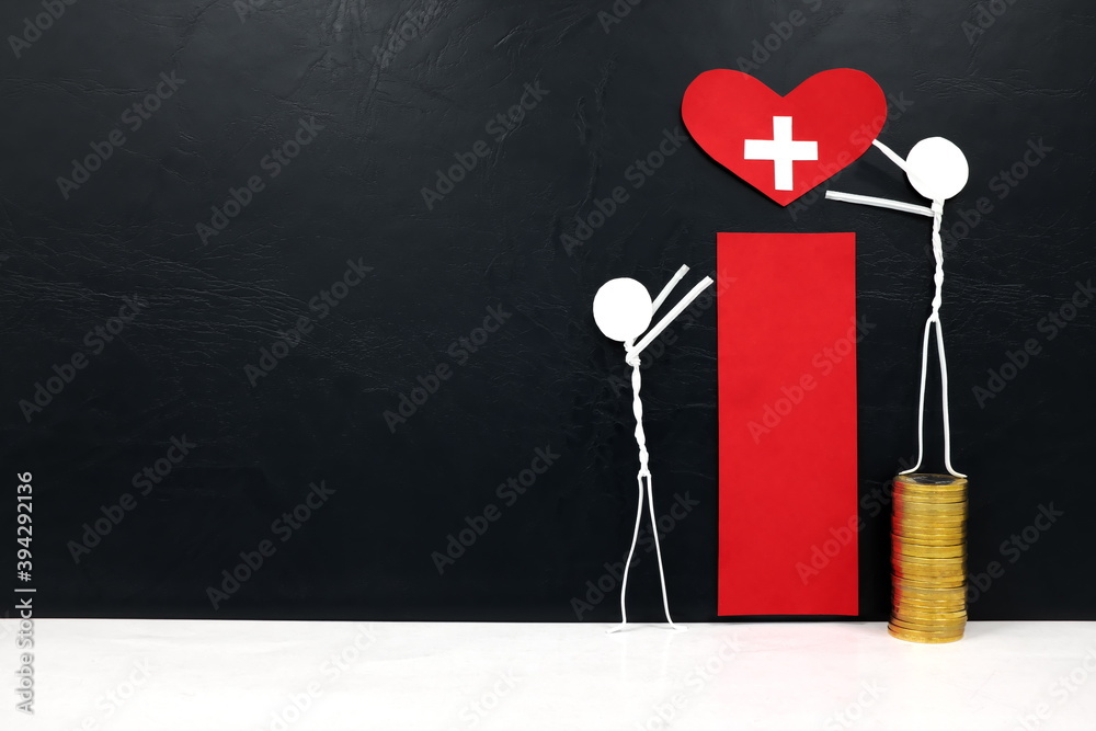 Stick man figure reaching for a red heart shape with cross cutout while stepping on stack of coins. Health, healthcare, medical care and hospital access inequality concept