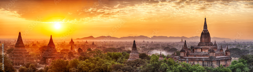 Panoramic sunrise over ancient city of Bagan in Myanmar