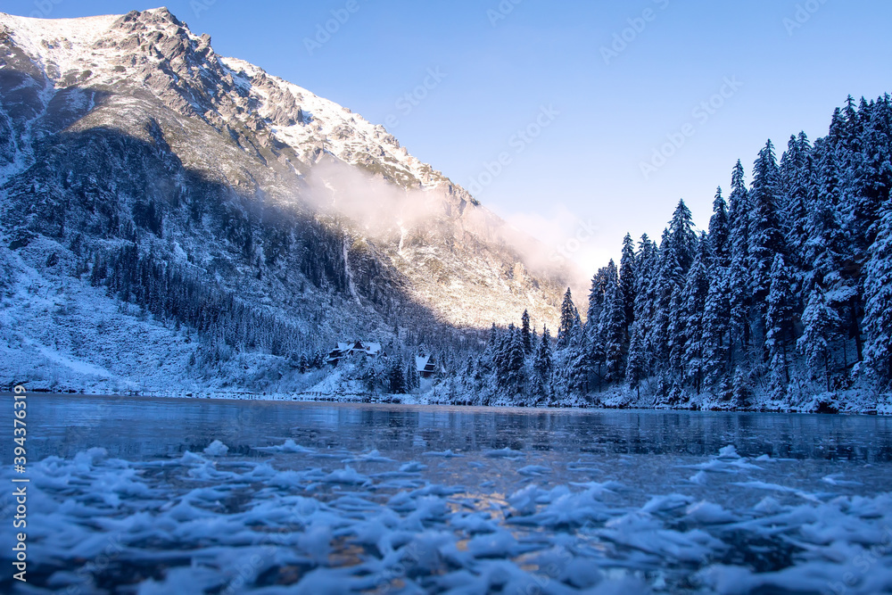 Winter frosty mountain landscape near ice lake. Amazing view on rocky mountains covered by snow.