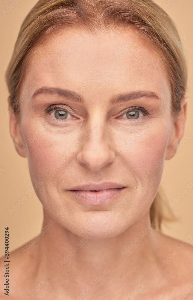 Close up of beautiful mature woman looking at camera isolated over beige background in studio, vertical shot