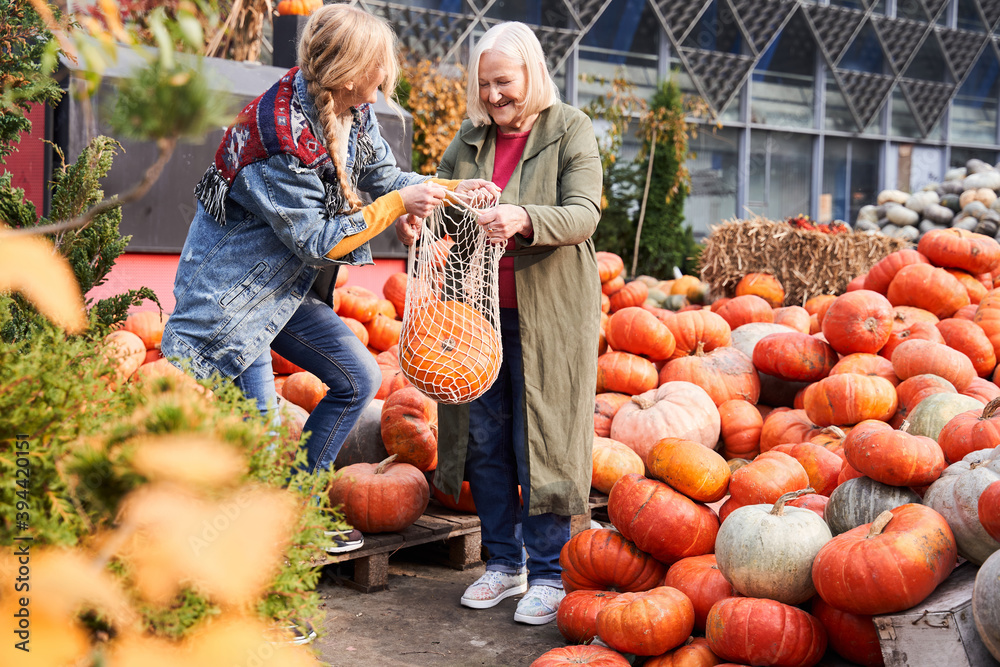 Daughter giving a string bag with a pumpkin to her stylish senior mother
