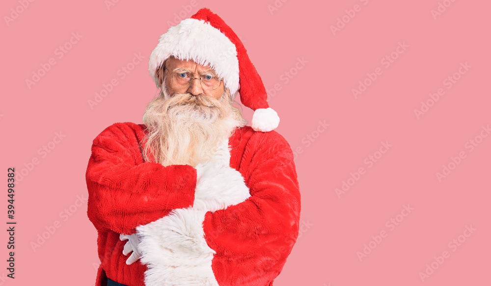 Old senior man with grey hair and long beard wearing traditional santa claus costume skeptic and nervous, disapproving expression on face with crossed arms. negative person.