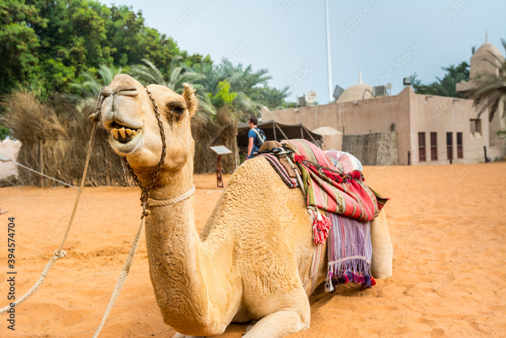 A Camel for the tourist riding in the Heritage folk village in Abu Dhabi, United Arab Emirates.