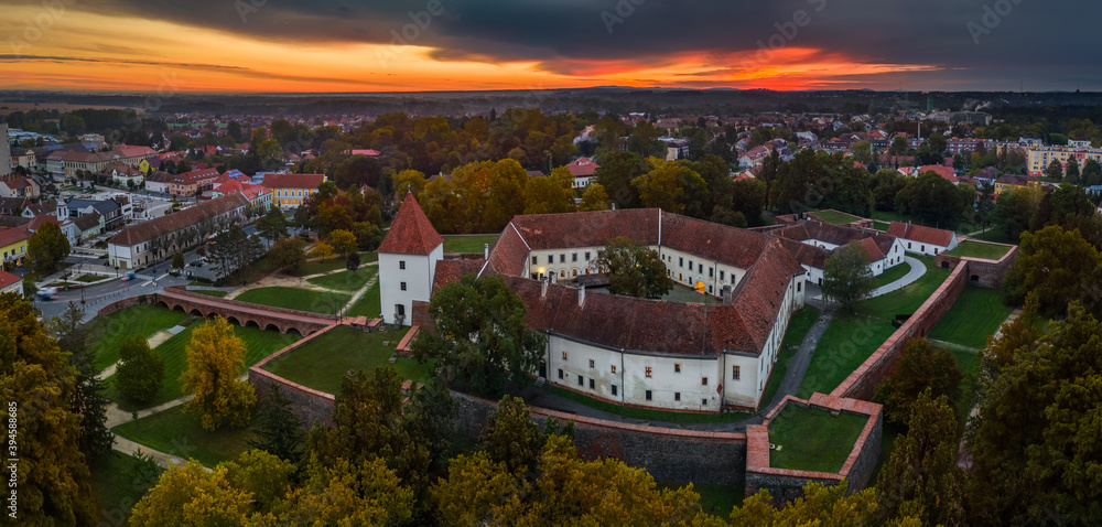 Sarvar, Hungary - Aerial panoramic view of the Castle of Sarvar (Nadasdy castle) with Sarvar Arboretum, a beautiful dramatic sunrise and rain clouds at background on a calm autumn morning