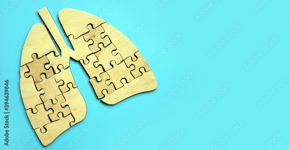 Wooden lungs from pieces of puzzles on the blue background.