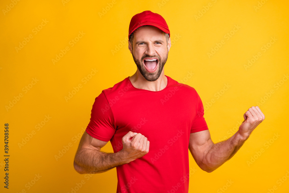 Photo of astonished courier guy top worker of month shout wear red t-shirt hat isolated yellow color background