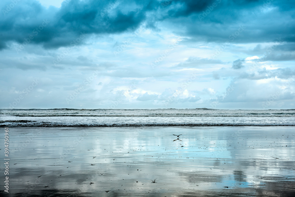 dramatic scene of a bird flying on the beach on a cloudy day.