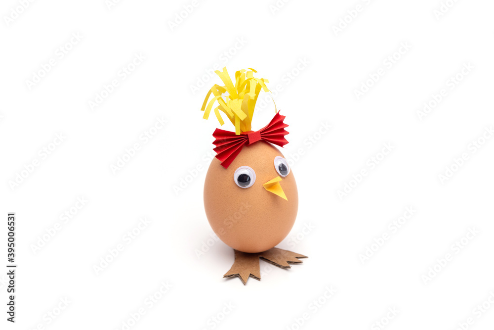 chicken toy craft made of eggshells and colored paper, simple activity for kids