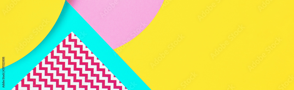 Abstract geometric fashion papers texture background in yellow, light pink, blue colors. Top view, flat lay