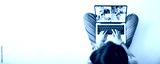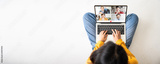 Top view of woman sitting on floor and using laptop video call conference her team. Panoramic image with empty copy space