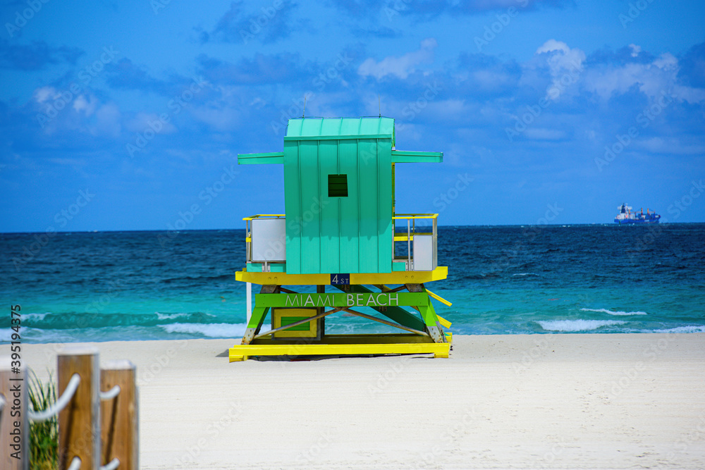 Miami Beach with lifeguard tower and coastline with colorful cloud and blue sky. Sunny summer day, with blue sky and Atlantic Ocean.