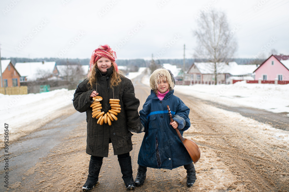 Two beautiful village girls stand on the road with balalaika and barankas in winter