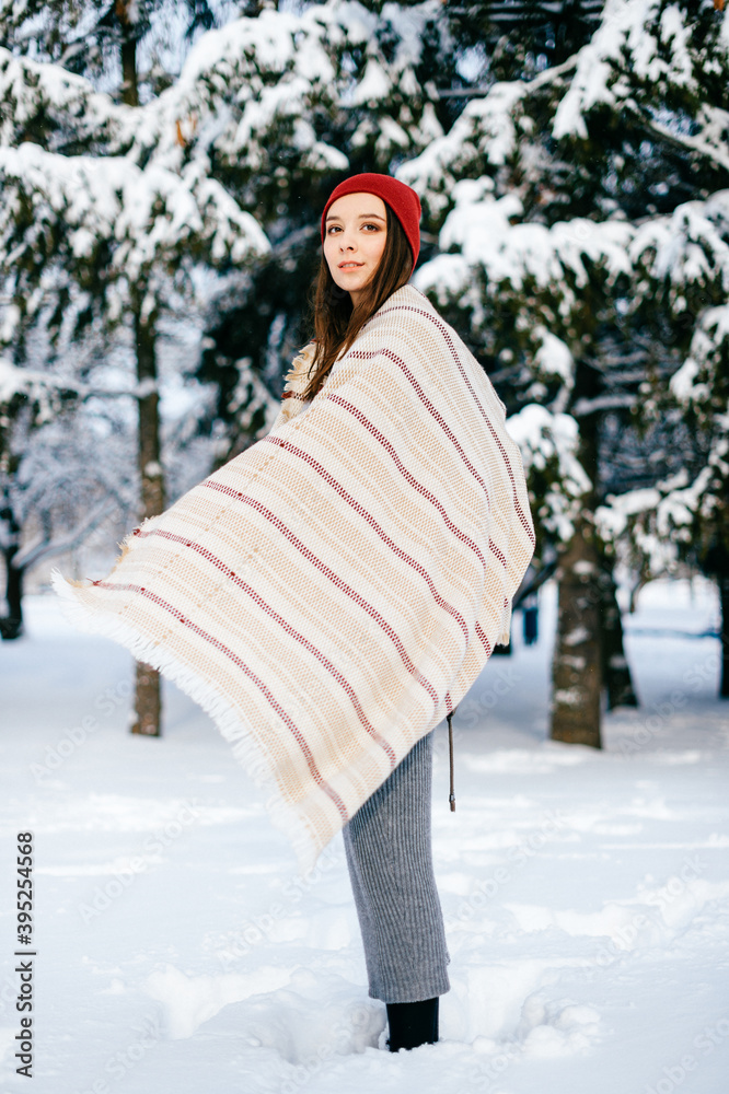 Young attractive brunette girl covering with a warm cape posing in the snow forest