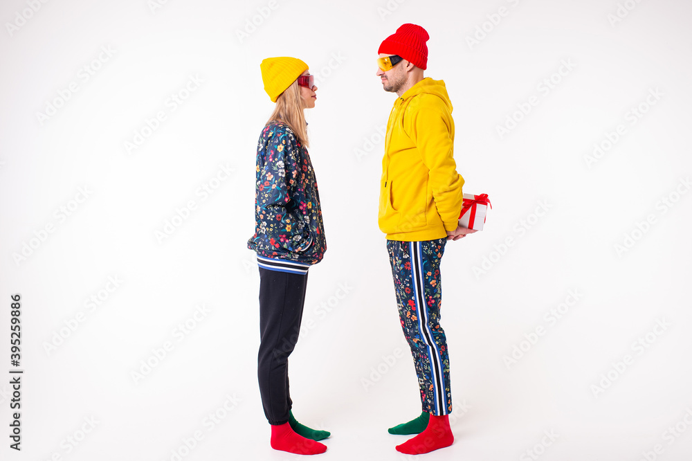 Stylish man hidding a gift from a girlfriend in colorful clothes over white background