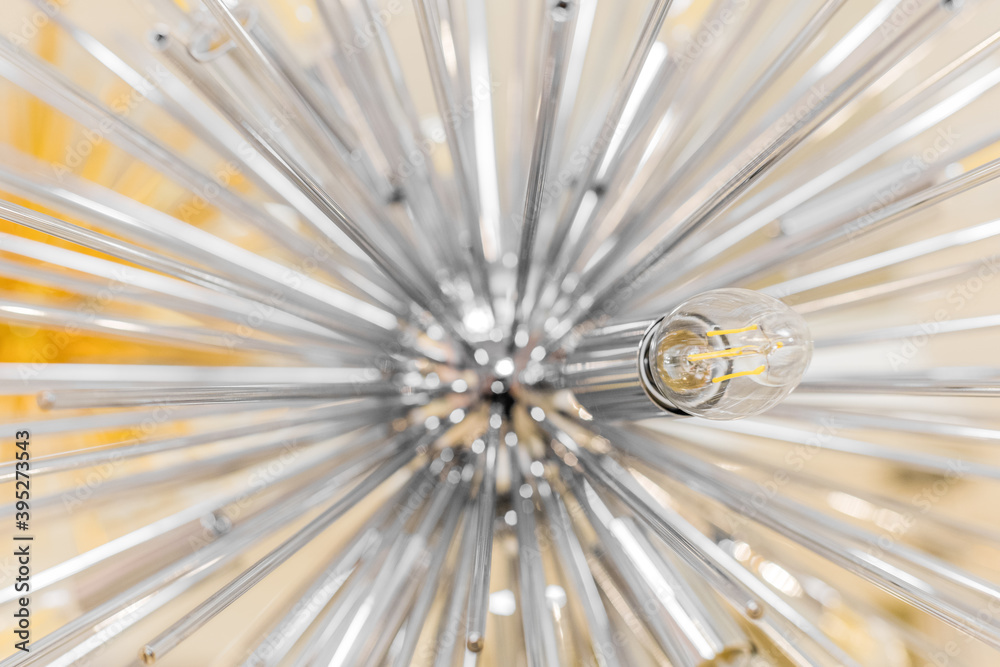 Close-up of a switched off incandescent lamp in a ceiling with a clear glass chandelier in the form of a modern style tube. The concept of decor for the hotel. Inside.