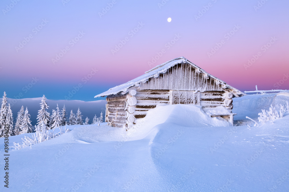 Winter scenery. Awesome sunrise. Old wooden hut on the lawn covered with snow. Landscape of high mountains and forests. Wallpaper background. Location place Carpathian, Ukraine, Europe.